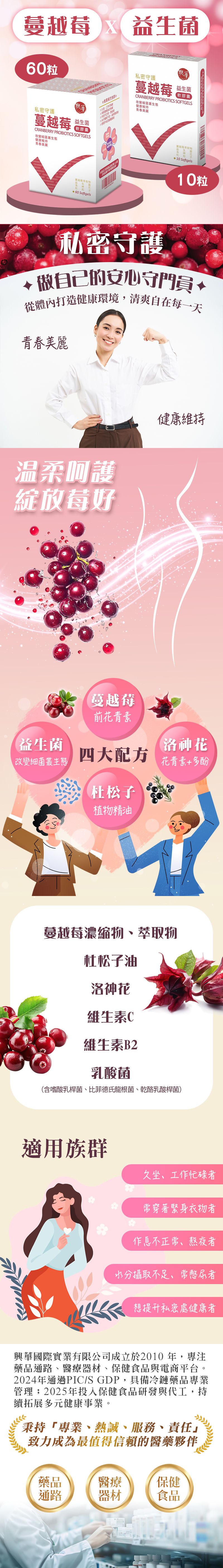 ✅蔓越莓:富含多酚類化合物與前花青素,維持體內自由基平衡。 ✅三重益生菌:嗜酸乳桿菌、比菲德氏龍根菌、乾酪乳桿菌,維持菌叢平衡。 ✅清除自由基:杜松子油、洛神花、維他命C,完美搭配 ✅私密保養補給