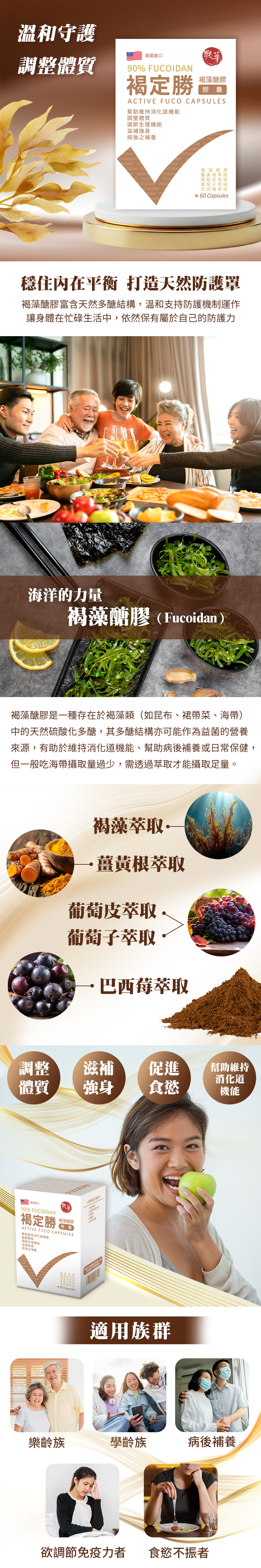 ✅海洋多醣體:褐藻醣膠 Fucoidan,易於人體吸收,吸收率更好 ✅強效抗氧化: 葡萄籽、巴西莓,富含抗氧化作用。 ✅超強保護力:薑黃素有助於對抗外界環境的變化,增加保護力,並調節生理,進而保持健康狀態。