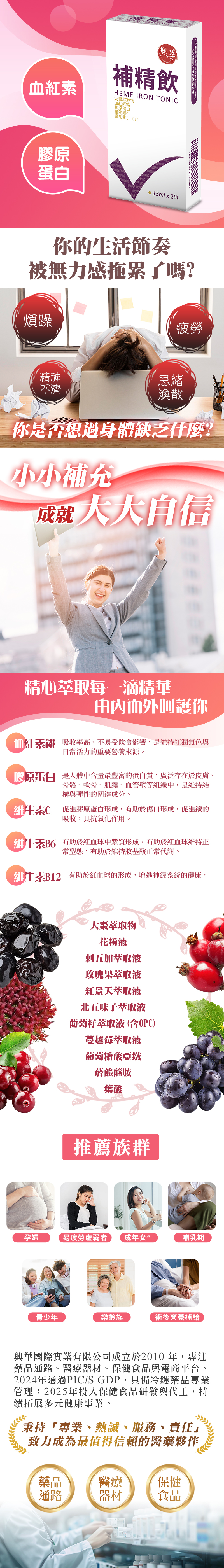 ✅ 含血紅素鐵與膠原蛋白雙重營養來源 ✅ 富含植物萃取:紅景天、花粉、刺五加、蔓越莓、葡萄籽 ✅ 添加維生素C、B群、葉酸營養補給,效果加倍 ✅ 每日一瓶的輕盈補給,給你好氣色、好彈潤 ✅ 適合產後或病中病後之補養,食慾不佳或體力不足者,是最佳營養補給品。